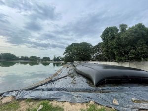 El dragado de sistemas lagunares generalmente va de la mano con separación de sólidos. La mezcla bombeada por nuestra draga es dirigida hacia una estación de floculación. Mediante la cuidadosa dosificación del correcto floculante, los lodos homogéneos se convierten en una mezcla heterogénea de agua y sólidos. Utilizamos tubos (o grandes sacos) de geotextil para deshidratar la mezcla ya floculada. El geotextil actúa como un filtro, capturando los lodos floculados y dejando pasar agua clarificada, la cual se retorna a la laguna o cuerpo de agua receptor.